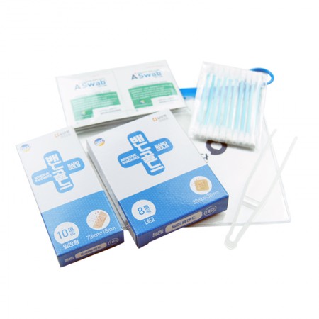 일반밴드, 밴드테이프, 알콜솜, 핀셋, 면봉 등 총 6종의 필수적인 응급 용품이 포함되어 있어 빠르게 응급 처치가 가능합니다. 이러한 구성은 구급함홍보물로 제공하기에 충분히 실용적입니다. ?